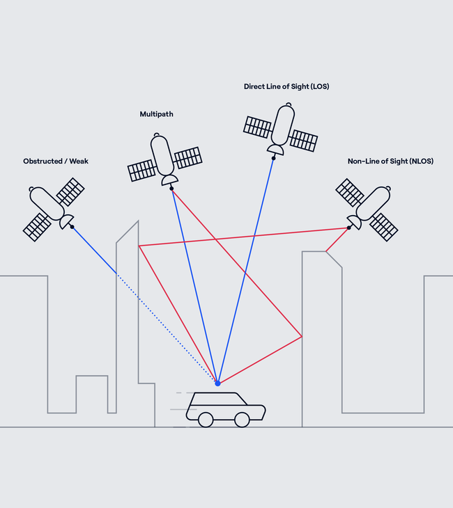 In urban environments, signals tend to bounce off buildings and other structures, creating reflections— known as multipath signals—that take slightly longer to reach the receiver. If the ADAS can’t carry out the technically extremely difficult task of distinguishing between these multipath signals and true line-of-sight signals, it can no longer compute an accurate GNSS position.