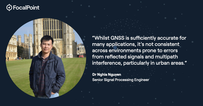 My role at FocalPoint involves working with the research and engineering teams to help develop our Supercorrelation™ technology – software that enhances the accuracy, reliability and security of GNSS positioning. As a team we’re continually working to improve location accuracy, opening new applications for innovation. Whilst GNSS is sufficiently accurate for many applications, it’s not consistent across environments prone to errors from reflected signals and multipath interference, particularly in urban areas.
