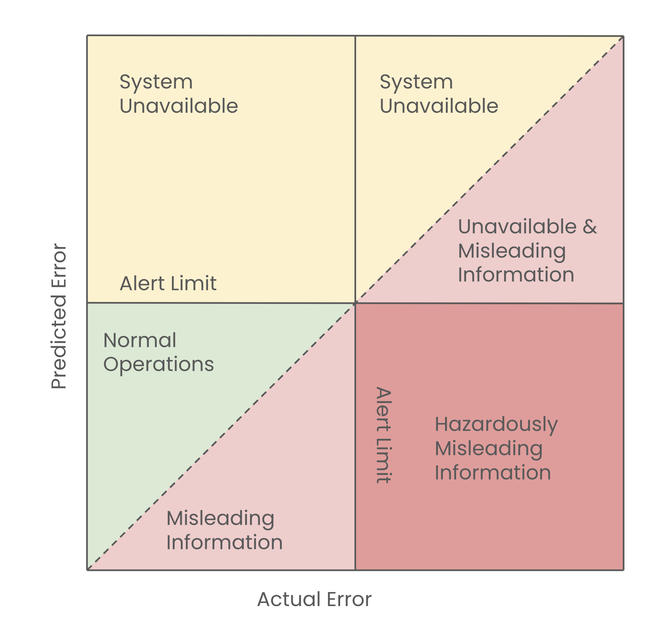 When these two variables consistently fall within a specified range—defined as ‘Normal Operations’ on the diagram—the receiver can consider its position estimates to be reliable. If they start to diverge, it’s an early warning that its estimates are becoming unreliable. If they start to diverge beyond an acceptable threshold (the ‘Alert Limit’), it means the estimated position risks being hazardously misleading and the receiver should raise an alert.